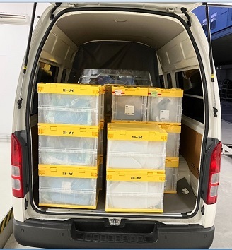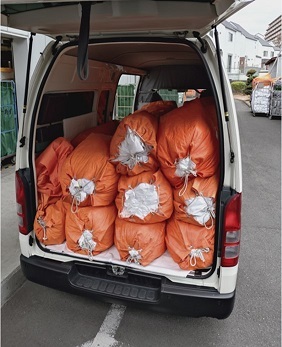 帰社後、回収したリネン類を車両から降ろします。